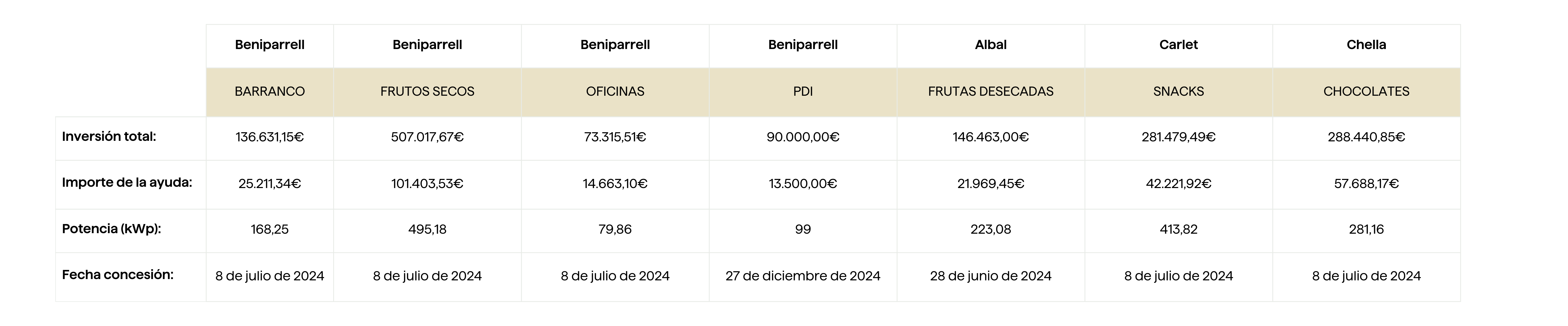Las instalaciones se han llevado a cabo en distintos centros productivos ubicados en Beniparrell (Barranco, Frutos Secos, Oficinas y PDI), Albal (Frutas Desecadas), Carlet (Snacks) y Chella (Chocolates), reforzando de forma homogénea la apuesta por el autoconsumo en toda la red industrial valenciana del grupo.